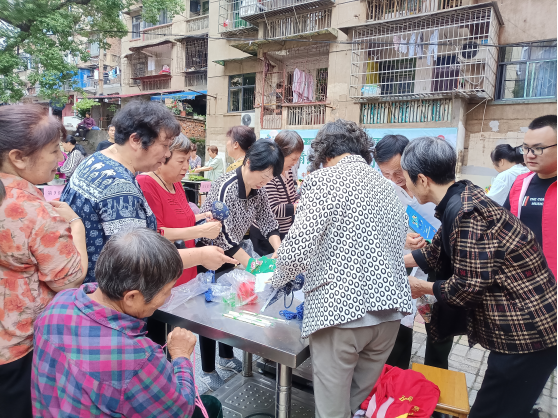 另一侧,艾草特有的清冽芬芳弥漫开来。艾草锤制作区里,大家将艾草包用彩色棉布包裹成紧实的锤头,再装上木柄,最后以棉线缠绕固定,随着一个个古朴实用的养生艾草锤逐渐成型。活动现场弥漫着艾草的清香,居民们在感受着传统手工艺魅力的同时,也学习到了中医养生的知识。