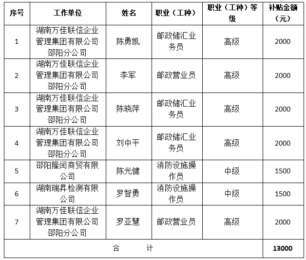 根据《湖南省人力资源和社会保障厅 省财政厅 省医疗保障局 国家税务总局湖南省税务局关于做好失业保险援企稳岗保生活工作的通知》 (湘人社规〔2024〕8号) 等文件精神,经审核,拟对符合条件的陈勇凯等7人发放技能提升补贴,为广泛接受社会监督,现将发放名单予以公示,截止日期为 2025 年2月24日。
